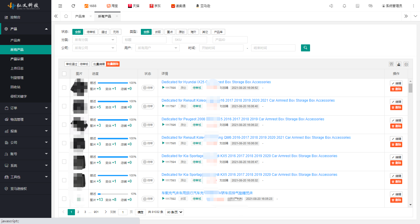 展示用戶所有產品了列表,包括一鍵采集產品及自建產品,主要包含產品圖片、狀態、標題等主要信息,如下圖所示: