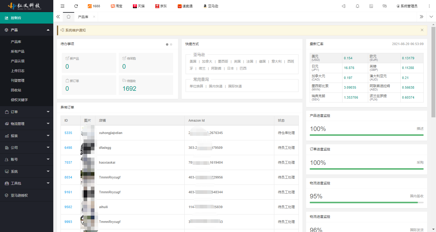 首頁展示系統最新通知、待辦事項、最新匯率以及用戶方便、快捷的定位查看自己店鋪的異常訂單等